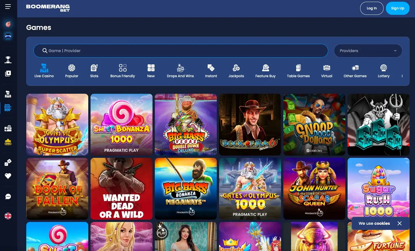 Boomerang Bet piedāvā plašu klāstu, tostarp spēļu automātus, galda spēles, tiešraides kazino, sporta totalizatoru, e-sporta derības un interaktīvus spēļu šovus.
